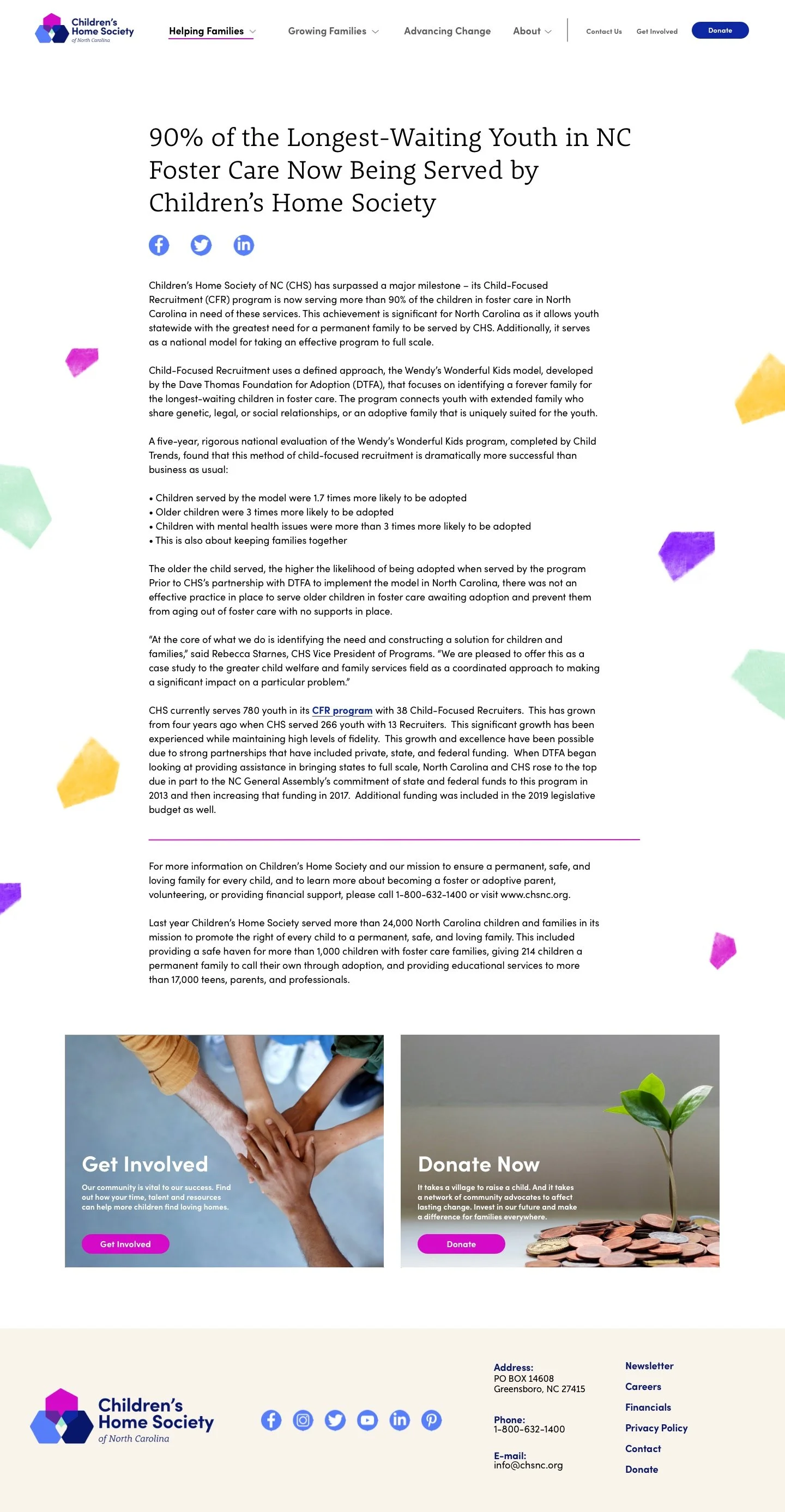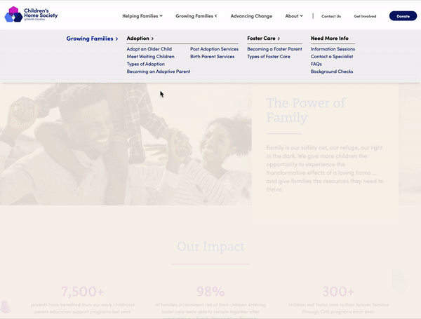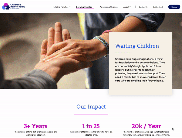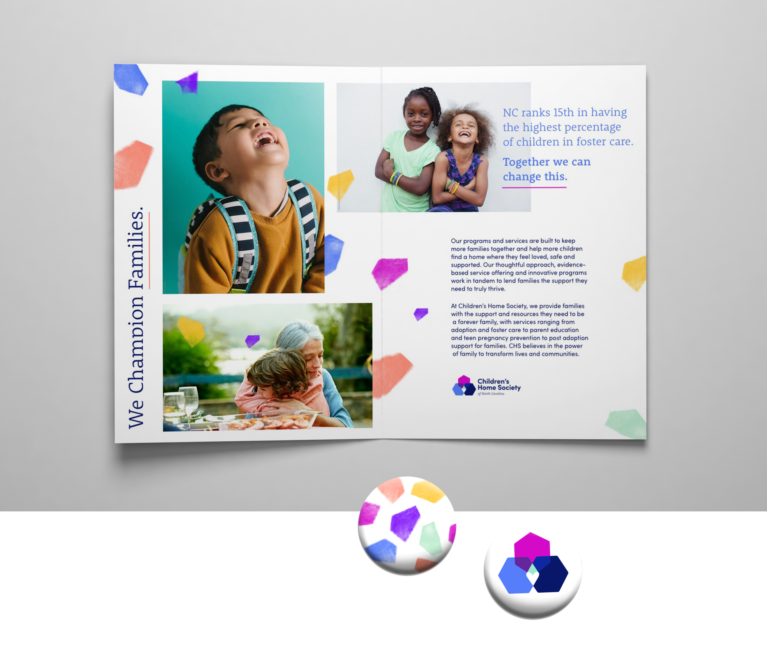 The Children’s Home Society of North Carolina specializes in education and prevention programs, family preservation, and adoption and foster care. Their belief is that strong families have the power to transform communities, and needed a rebrand that helped them better represent who they are and why they are different. They wanted their new appearance to communicate strength and care, while also feeling more modern and less “child-like”.