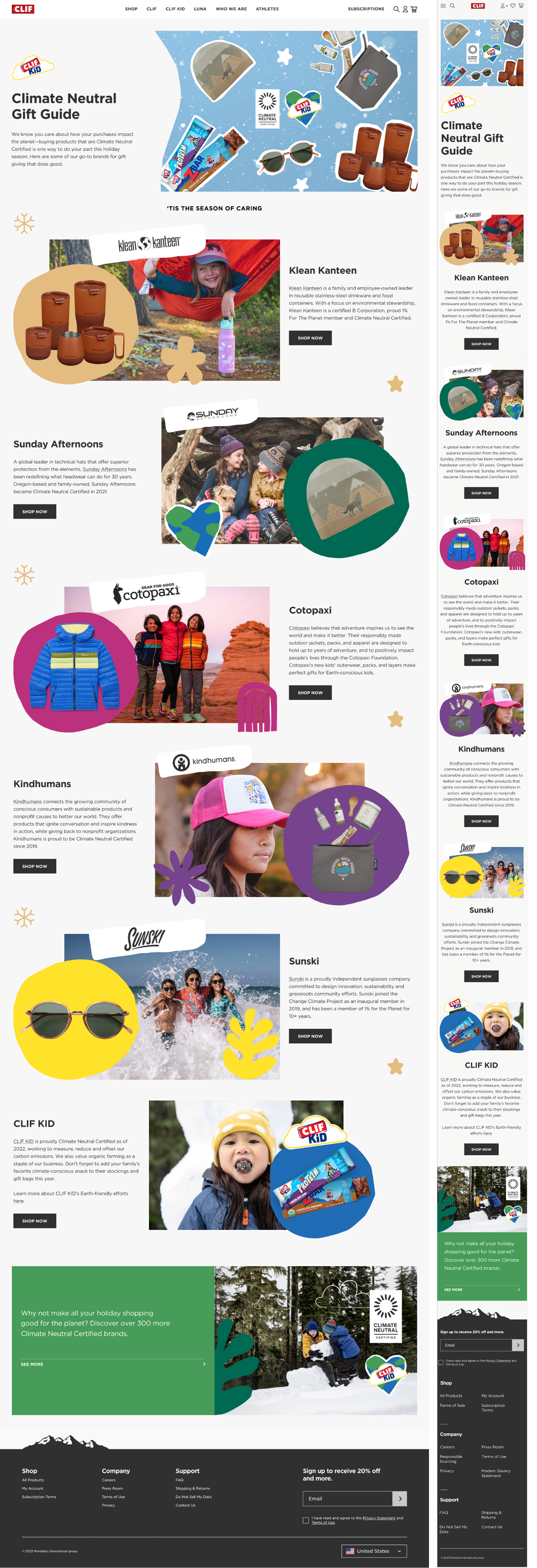 How do you keep a legacy brand exciting? This was our ongoing task in our work with Clif Bar and it’s suite of brands. By using interchangeable components within the DTC website, we created compelling visuals to reflect brand personality, new product launches, and athlete partnerships. In addition to ongoing site creative, we were also responsible for extending those visuals to landing pages and social media for a holistic approach. Each brand has a distinct voice and aesthetic, while still feeling like a family.